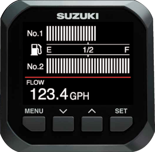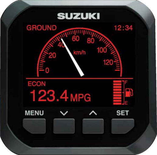 Boaters can enhance their boating experience by combining their Suzuki outboard motor with Suzuki’s latest Suzuki Multi-Function Gauge 4” (SMG4). The screen displays a wide array of data including engine rpm, speed, trim angle, and more.